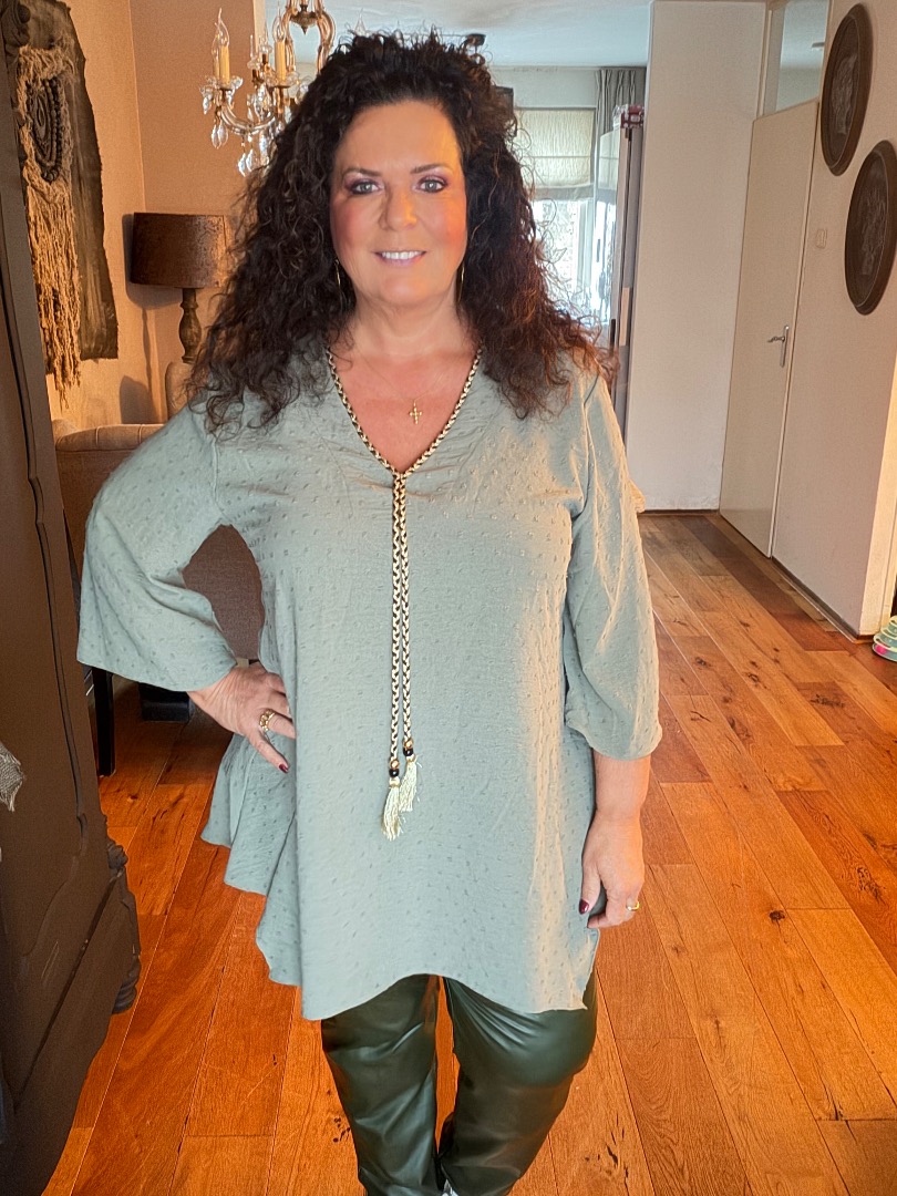 100% viscose shirt, mooi detail langs de hals door door middel van een koord. Op de stof zit een heel leuk dotje.