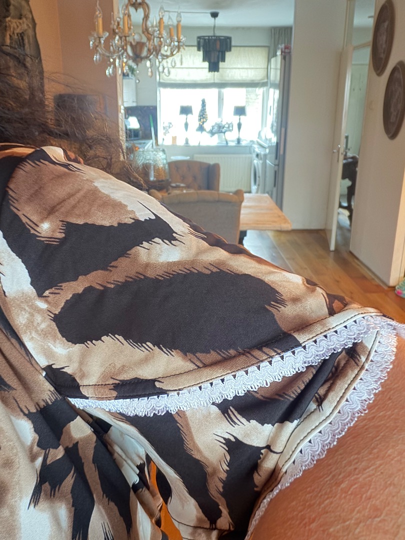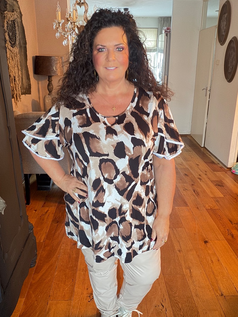 Polyester met elastan a lijn shirt. Met een mooie dubbele mouw die afzet is met een wit kantje