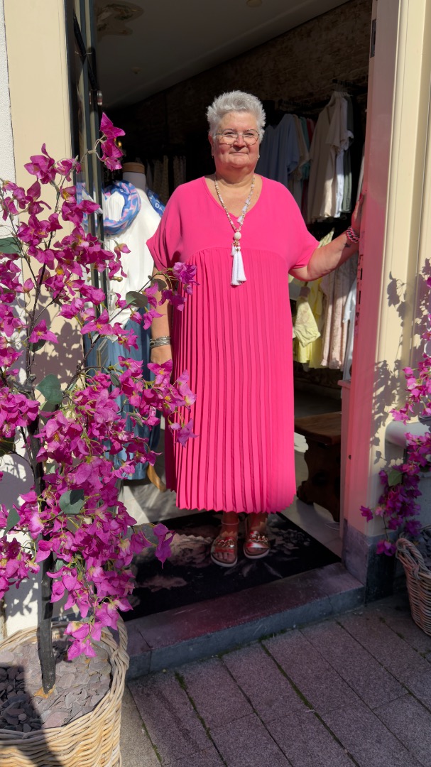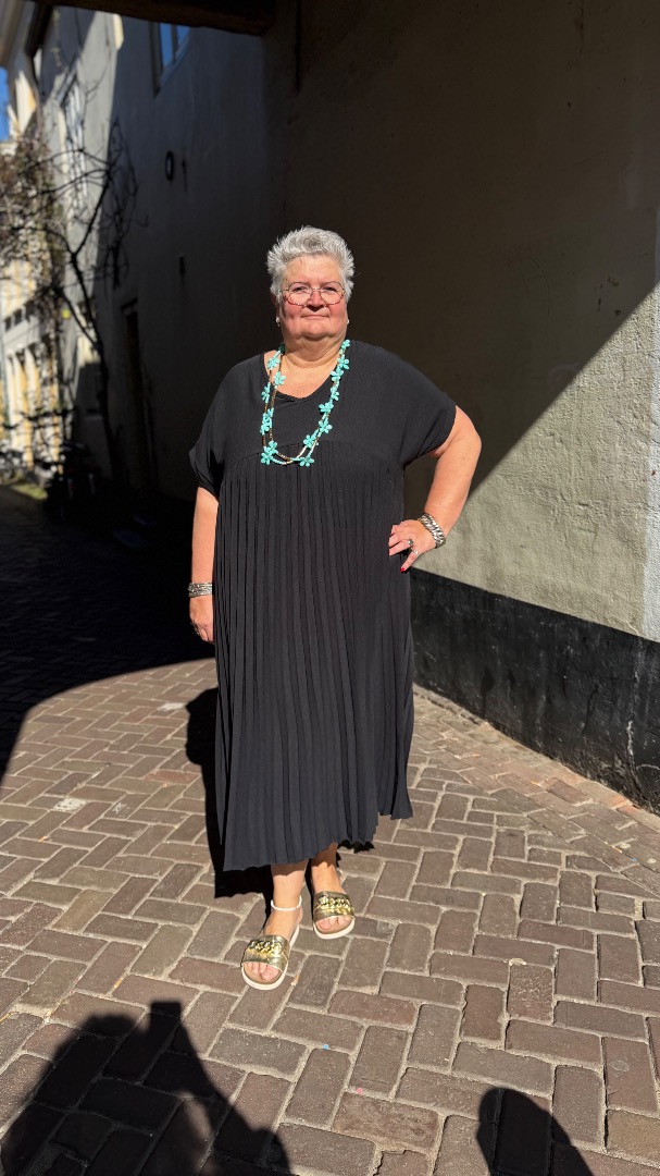 Trendy plissé jurk met plat bovenstuk zodat hij erg slank makend valt. gemaakt van 95% viscose en 5% elastan. heeft een oto van 80 en lengte van 130. draagbaar vanaf 52 t/m 58