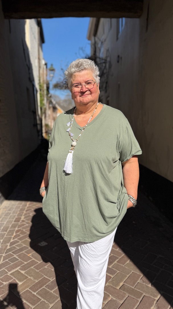 Fijn katoen met elastan basis shirt. Fijne v hals die afgewerkt is met subtiele gouden bies. heeft een oto van 75, lengte van 80. draagbaar van 46 t/m 52