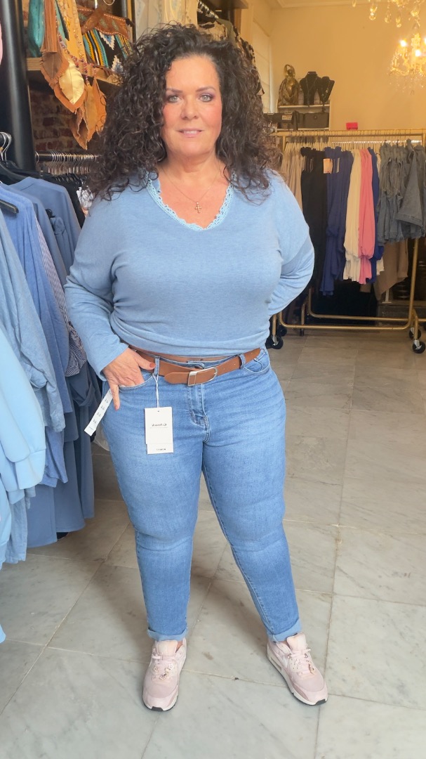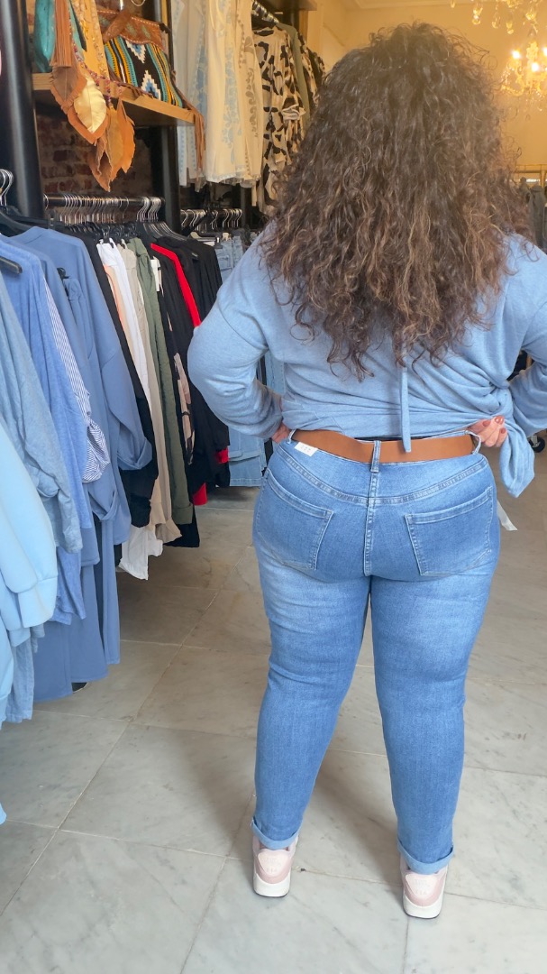 In het mom fit model. Dus iets wijder op het bovenbeen en de heupen