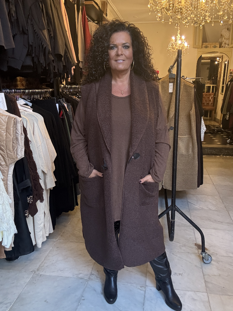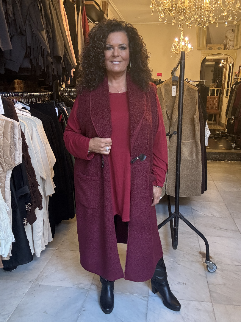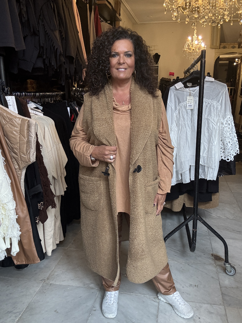 Trendy lang Gilet. gemaakt van lekkere Teddy stof. 70% viscose en 30% Polyester.