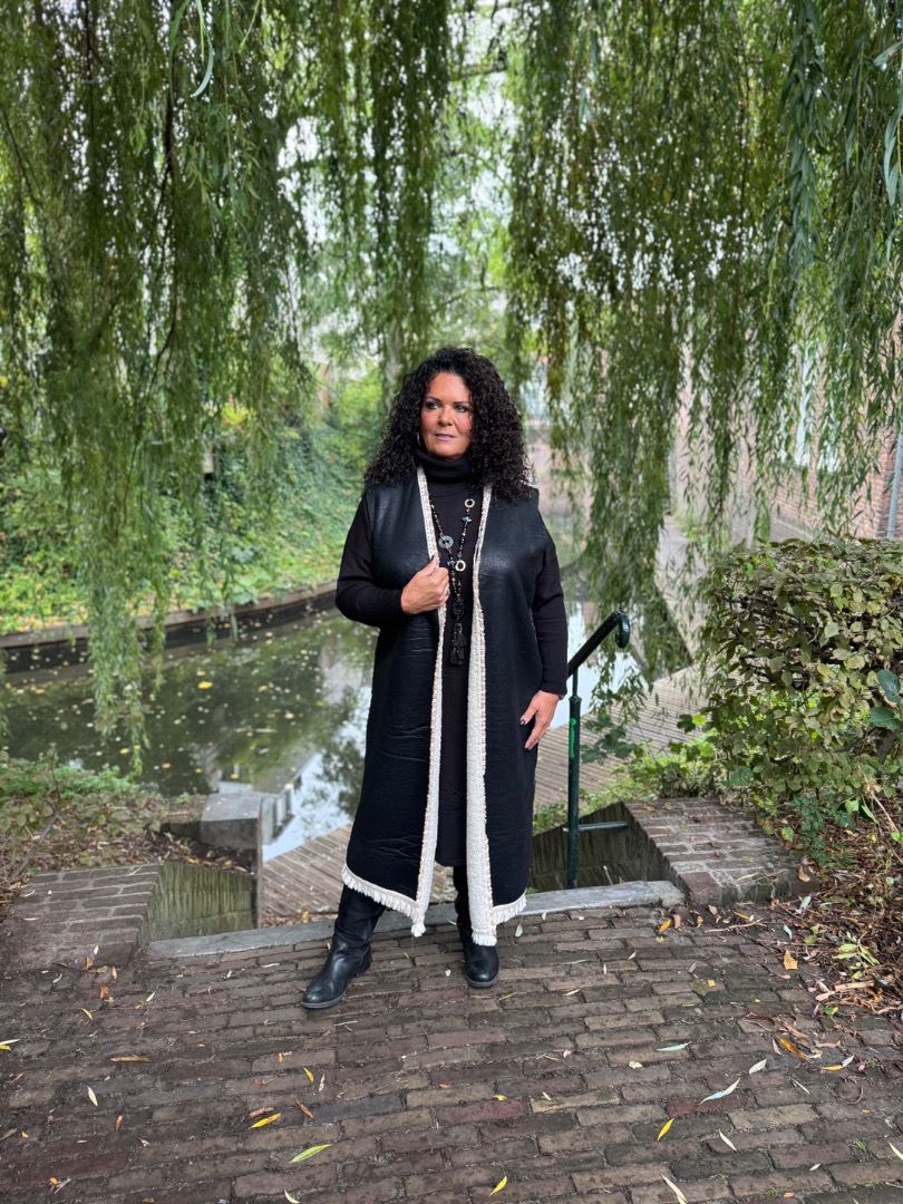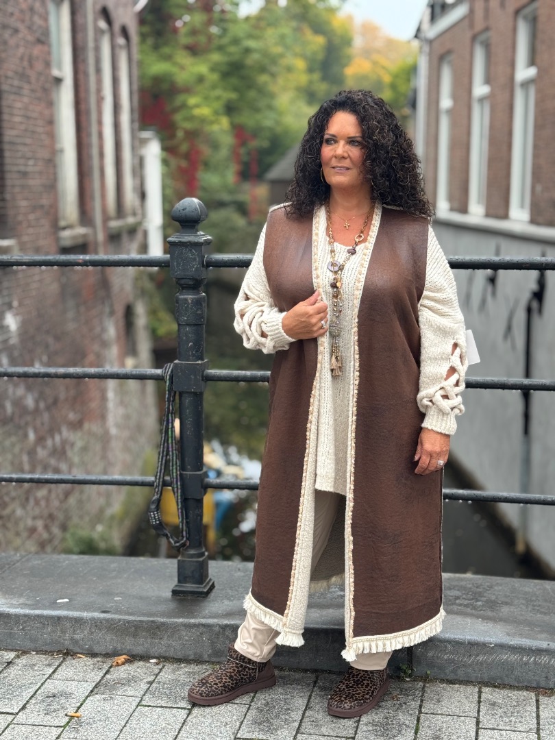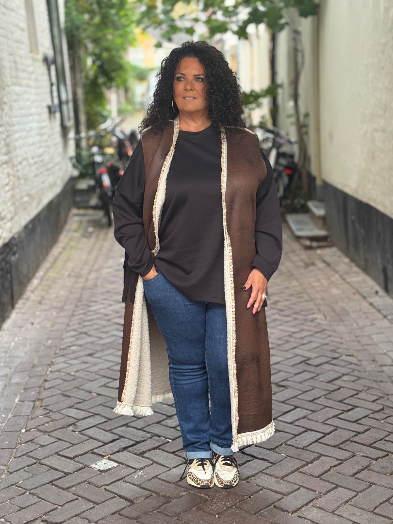 Draag je maat 48/50 kun je kiezen, kies je voor de kleinere maat, dan zal de twee panden meer aansluiten zijn aan de voorzijde. Kies je voor de grotere maat, kun je hem dragen met een lekkere dikke trui, en kun je de twee panden aan de voorzijde over elkaar slaan