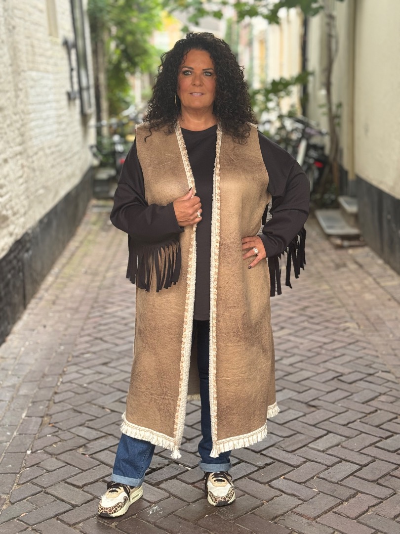 Kijk eens wat een gaaf gilet. Gemaakt van mooie zachte suedine look. En geel gevoeld met een super zachte Teddy stof.