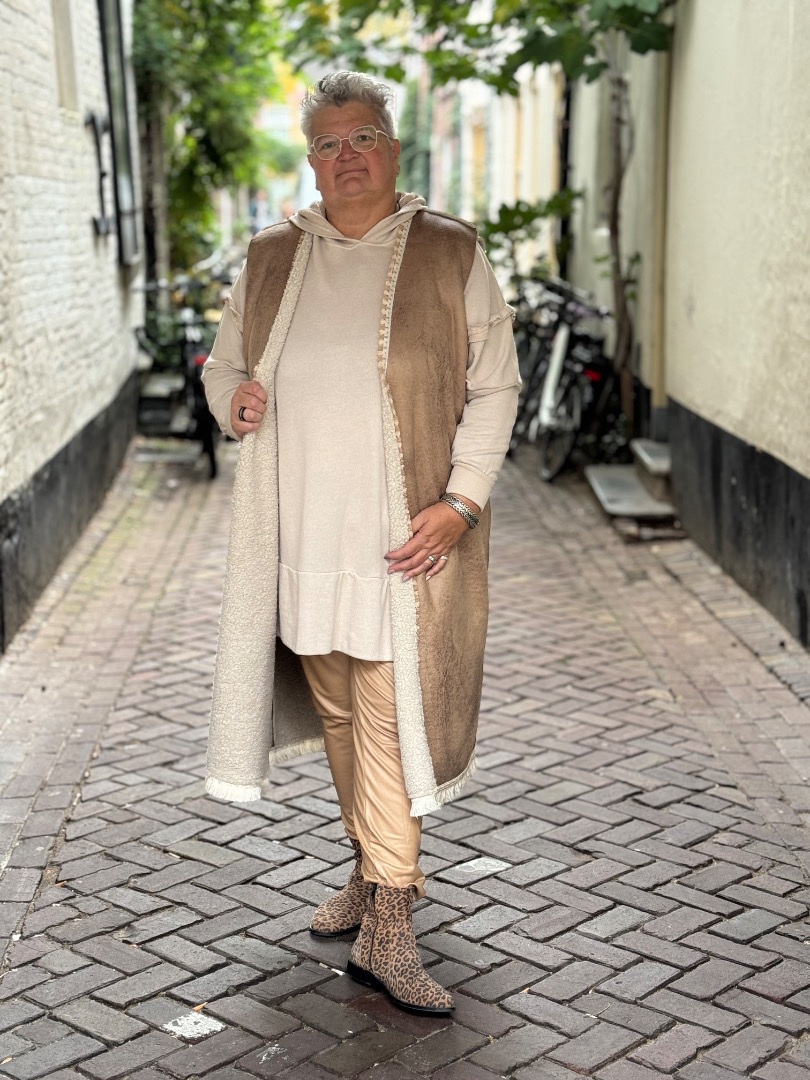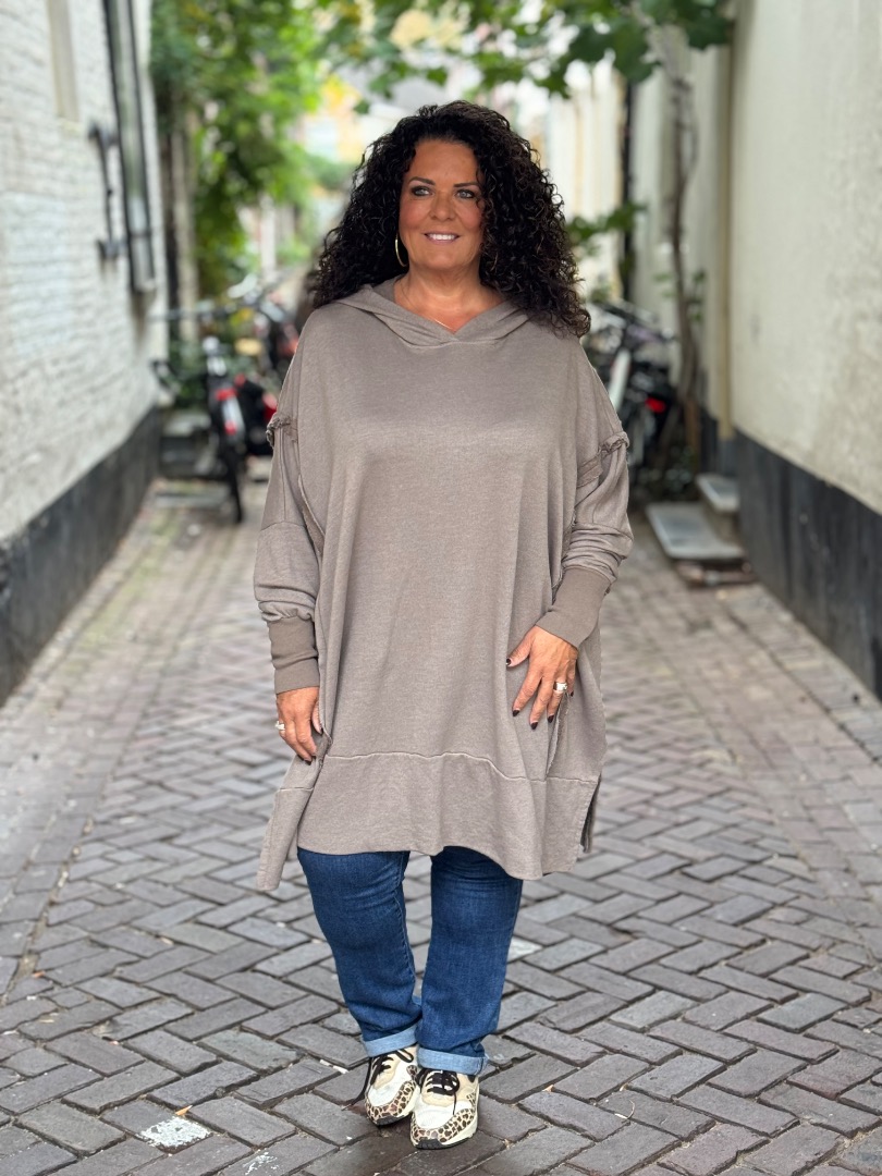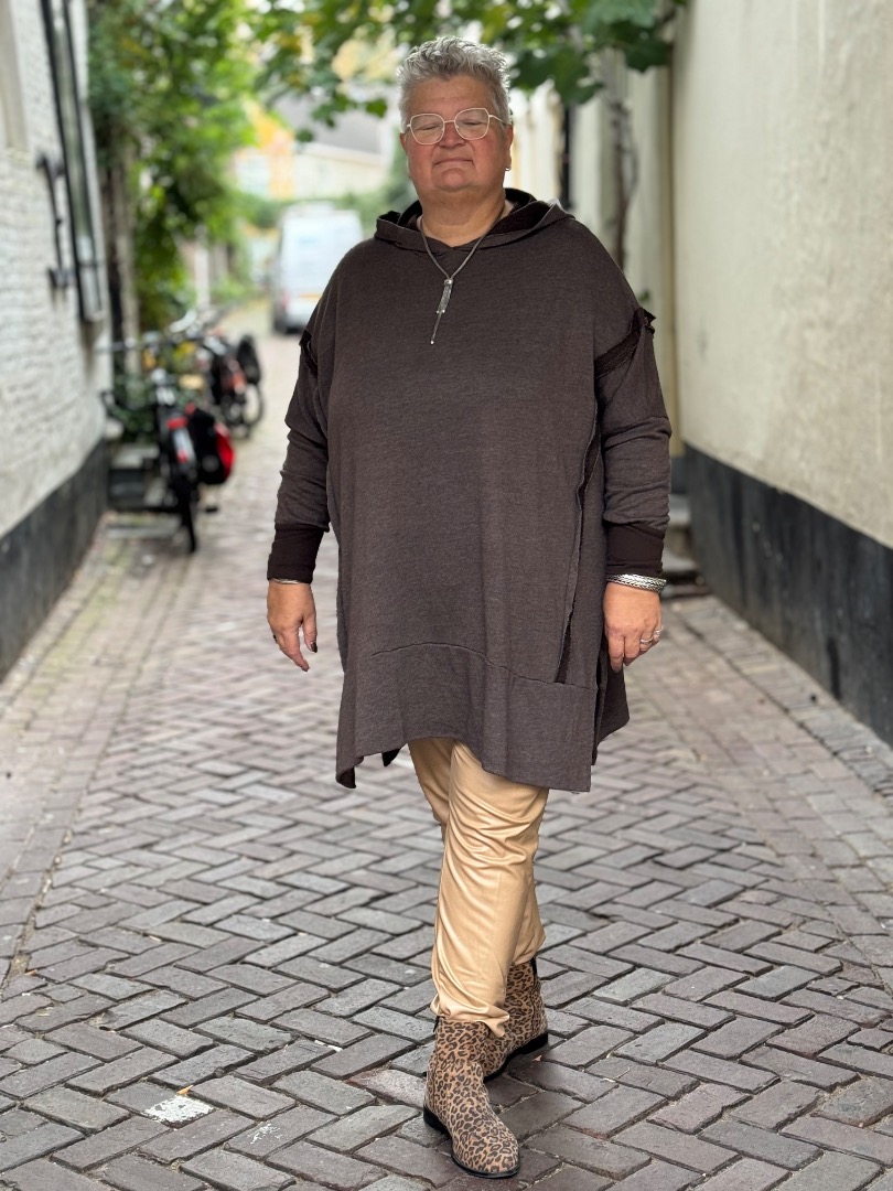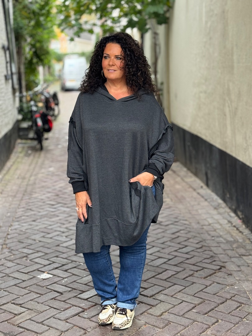 Zelf ben ik 162 cm en draag ik 44/46, maar ik vind hem hartstikke leuk staan. Lekker oversized.