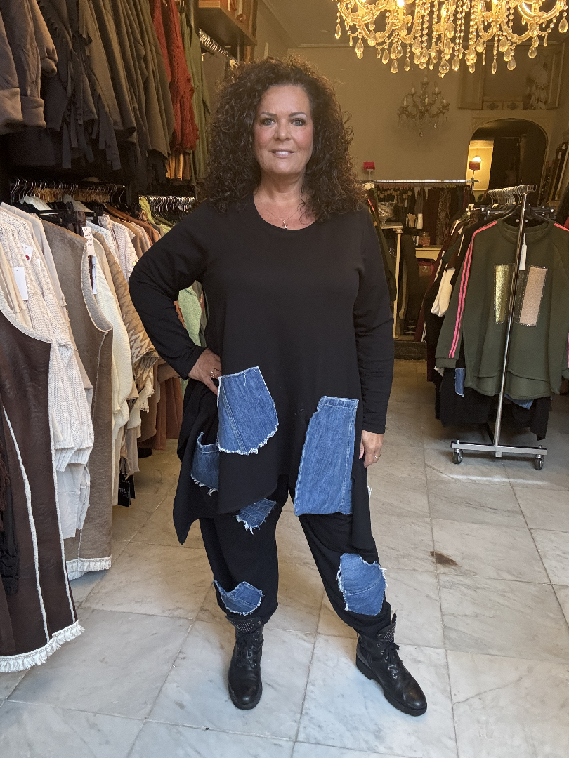 Katoenen shirt, mooi a lijn met veel stretch. Heeft een oksel tot oksel van 60, lengte voor in het midden 85, naar de zijkanten toe ruim 90. Past vanaf 44 tot en met 48
