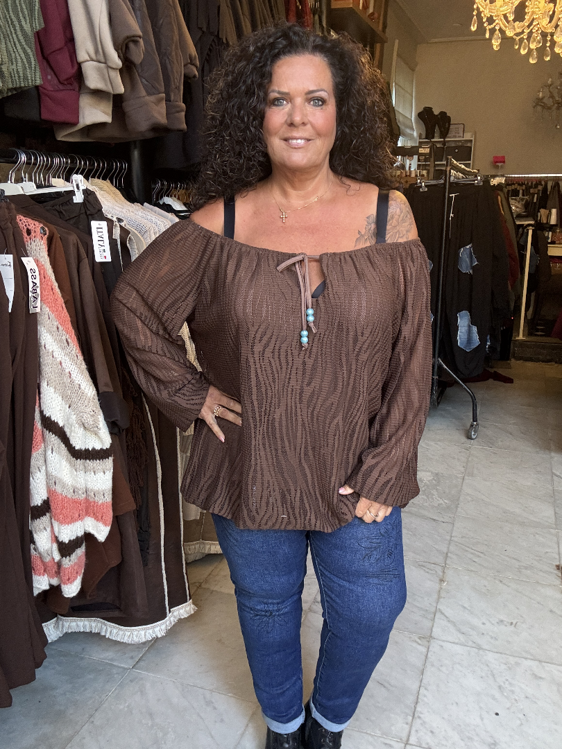 Elastiek aan de hals,zodat je hem ook off shoulder kunt dragen.