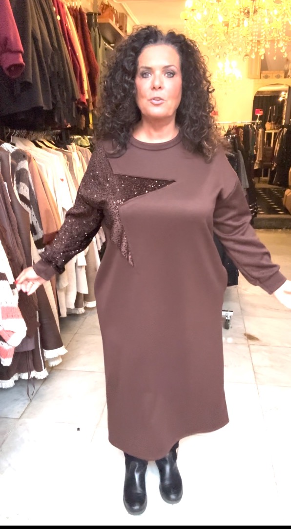 De bruine jurk heeft een oksel tot oksel van 70 en een lengte van 125