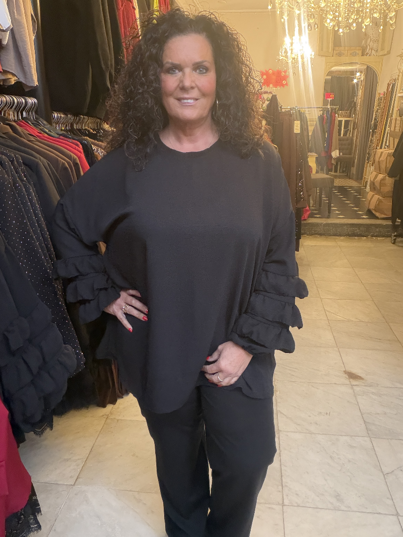 Leuke tuniek met roezels aan de mouwen. gemaakt van 60% polyester 35% viscose en 5% elastan. Heeft een oksel tot oksel van 80 en een lengte van 85. draagbaar vanaf maat 46 tot en met 52 ruim