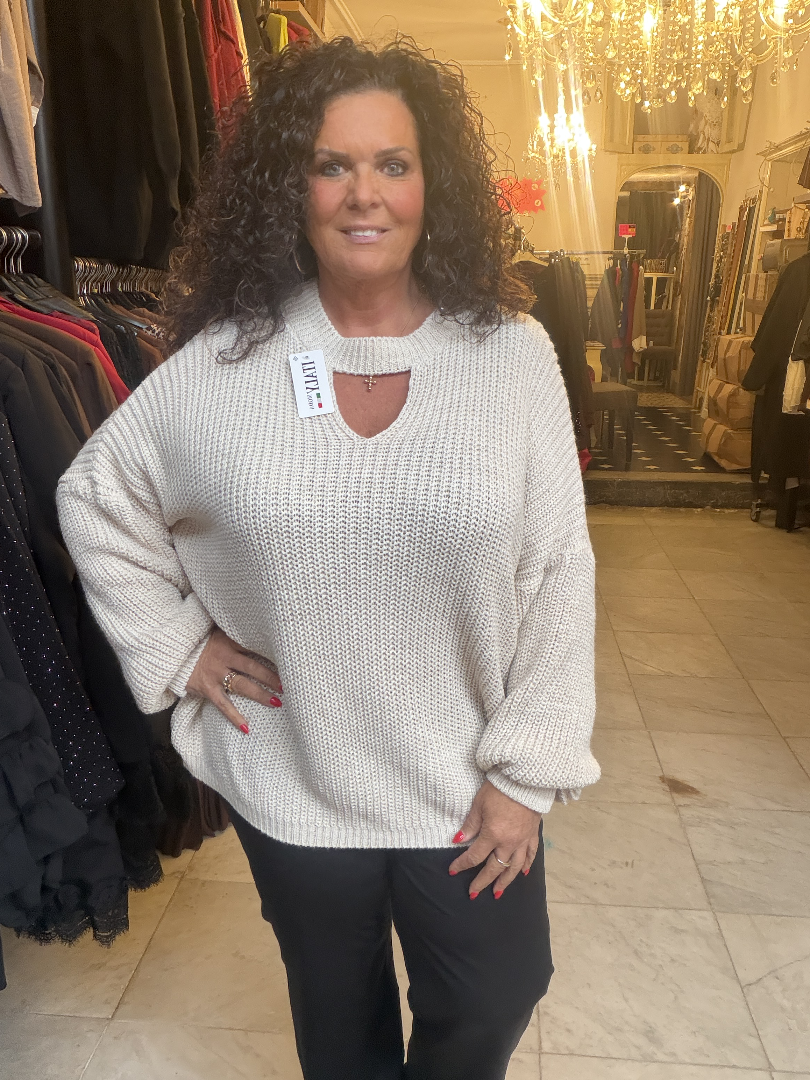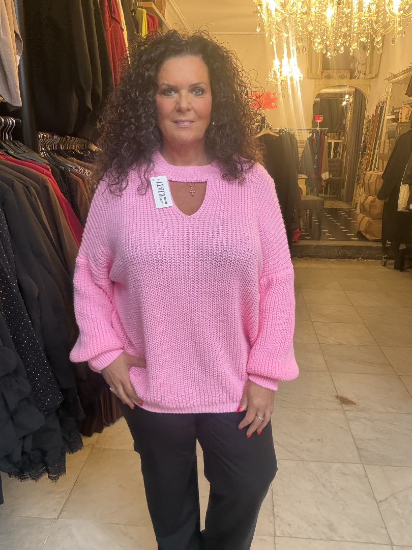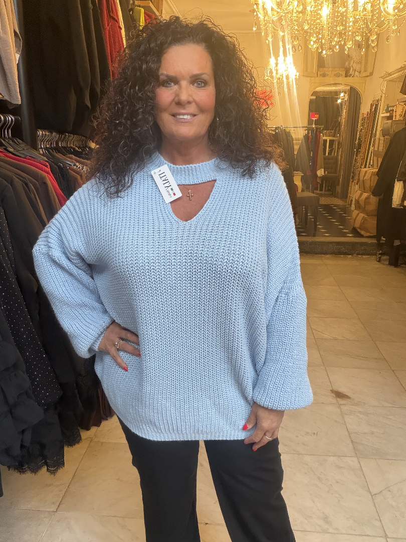 Acryltrui met apart detail aan de hals.