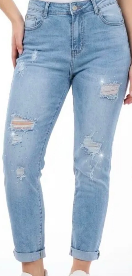 Super stretch, hoog in de taille. Met knoop en rits en lusjes. Deze heeft leuke trendy scheuren met. Strass