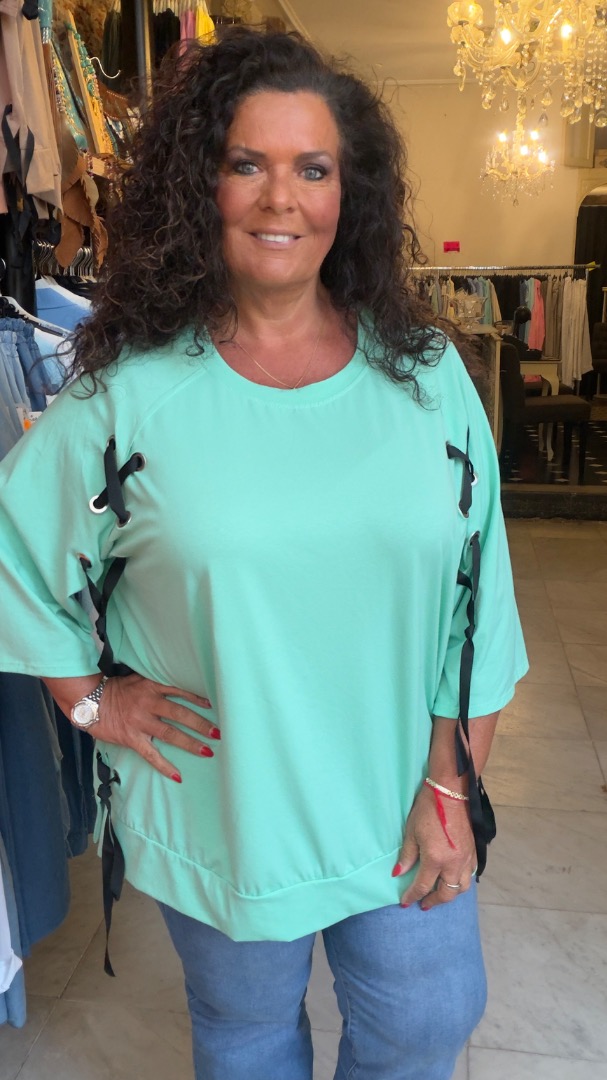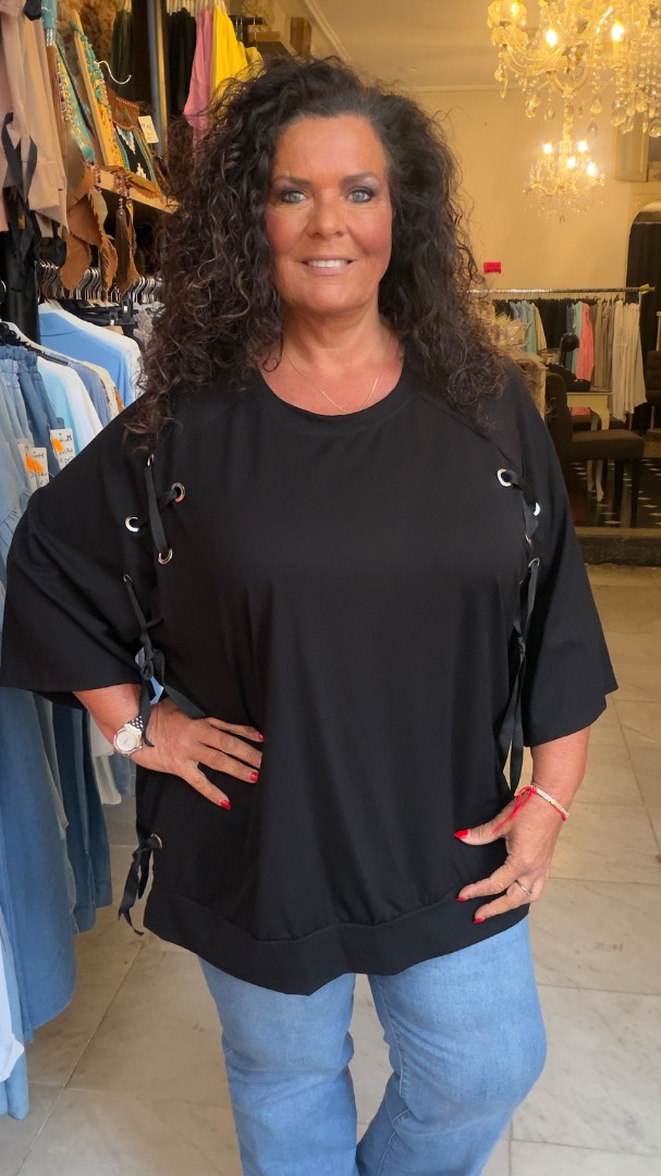 Stoer t shirt gemaakt van 95% katoen en 5% elastan. leuk lint detail aan de zijkant. heeft een oksel tot oksel van 76 en een lengte van 80. Draagbaar vanaf maat 44 tot en met met een kleine 52.