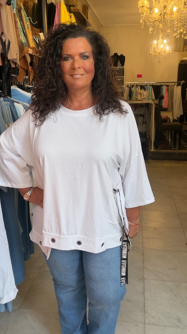 Katoen met elastan shirt. Ook hier weer veel details. heeft een oto van 78 lengte voor 70 lengte achter 80. zeer geschikt voor op zo'n trendy band plooi broek. draagbaar van maat 44 t/m 50/52